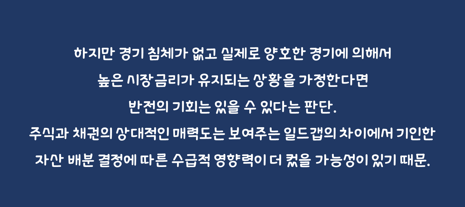 • 하지만 경기 침체가 없고 실제로 양호한 경기에 의해서 높은 시장금리가 유지되는 상황을 가정한다면 반전의 기회는 있을 수 있다는 판단. 정말 높은 금리가 경기에 기반한 움직임이라면, 최근 주식시장의 하락은 금리 상승에 따른 할인율 증가와 같은 밸류에이션 디레이팅 영향보다는 주식과 채권의 상대적인 매력도는 보여주는 일드갭의 차이에서 기인한 자산 배분 결정에 따른 수급적 영향력이 더 컸을 가능성이 있기 때문.