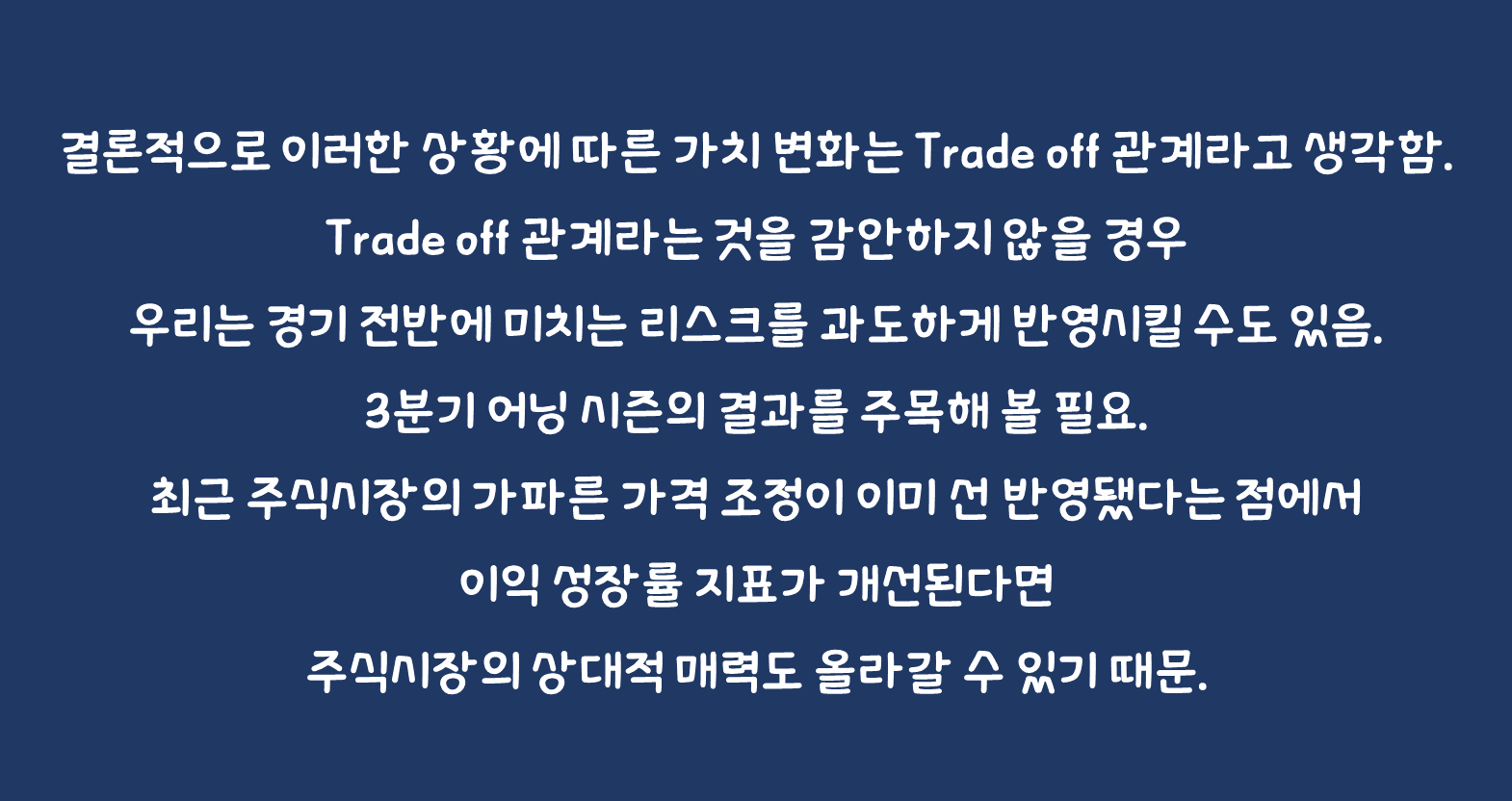 • 결론적으로 이러한 상황에 따른 가치 변화는 Trade off 관계라고 생각함. Trade off 관계라는 것을 감안하지 않을 경우 우리는 경기 전반에 미치는 리스크를 과도하게 반영시킬 수도 있음.