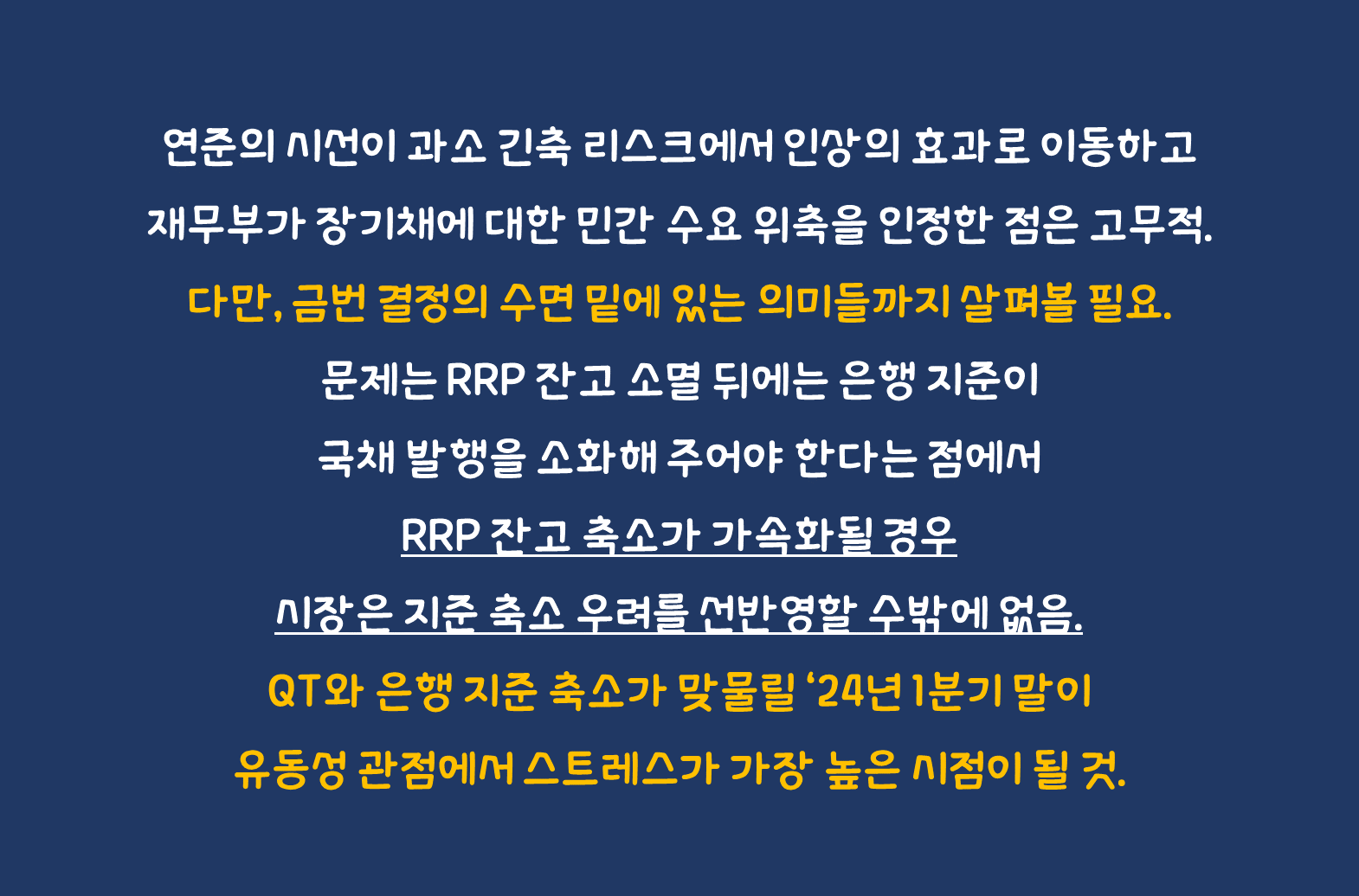 연준의 시선은 과소 긴축 리스크에서 인상의 효과 점검으로 이동. 재무부 역시 단기채 위주 발행으로 시장의 수급 부담 완화. 다만, 재무부의 단기채 위주 발행은 RRP 잔고 소진을 가속화한다는 점에서 유동성 긴축은 가속화될 것.