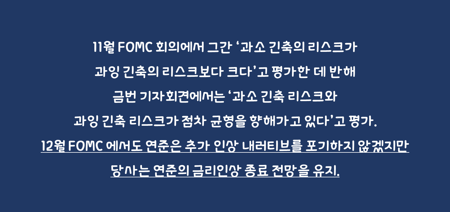 12월 FOMC에서도 연준은 추가 인상 내러티브를 포기하지 않겠지만 당사는 연준의 금리인상 종료 전망을 유지. 지금부터는 뒤늦은 금융 환경 긴축이 뒤늦은 지표 둔화로 이어지는 지 여부가 중요한 국면. 시장의 핵심 재료는 연준의 긴축 의지에서 펀더멘털로 전환.
