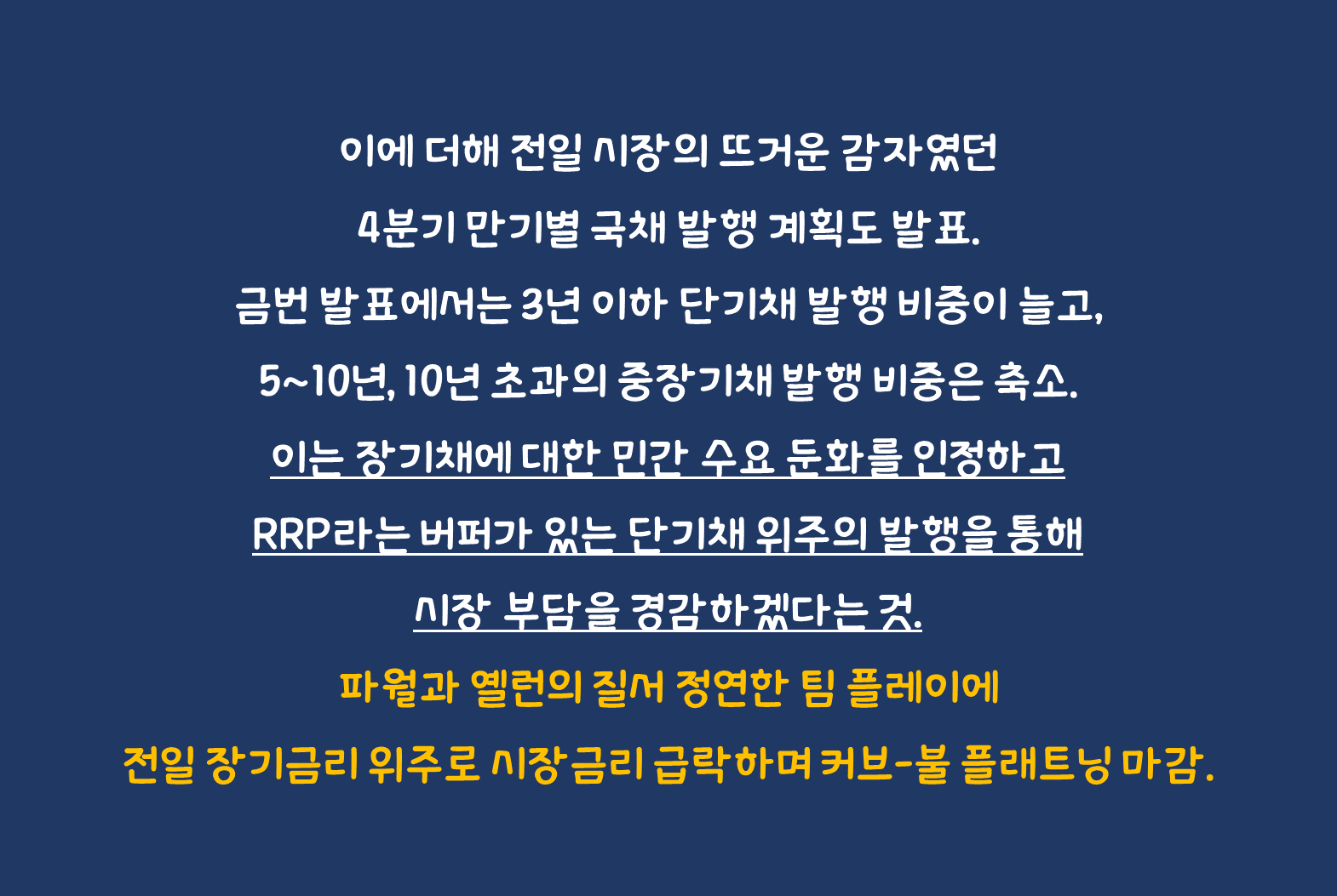 이에 더해 전일 시장의 뜨거운 감자였던 4분기 만기별 국채 발행 계획도 발표. 당사는 미국 재무부의 PD 질의서를 근거로 단기채 발행 비중이 높아질 것으로 전망한 바 있음. 실제로 금번 발표에서는 3년 이하 단기채 발행 비중이 늘고, 5~10년, 10년 초과의 중장기채 발행 비중은 축소. 이는 장기채에 대한 민간 수요 둔화를 인정하고 RRP라는 버퍼가 있는 단기채 위주의 발행을 통해 시장 부담을 경감하겠다는 것. 파월과 옐런의 질서 정연한 팀 플레이에 전일 장기금리 위주로 시장금리 급락하며 커브-불 플래트닝 마감.
