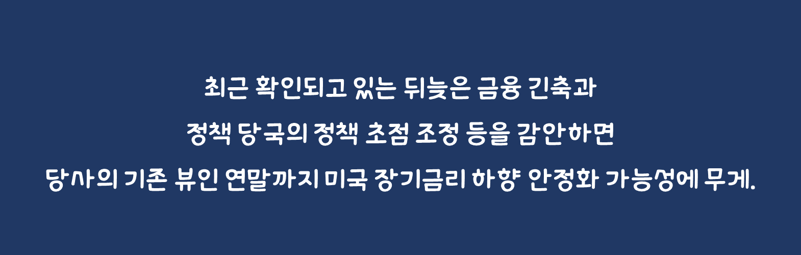최근 확인되고 있는 뒤늦은 금융 긴축과 정책 당국의 정책 초점 조정 등을 감안하면 당사의 기존 뷰인 연말까지 미국 장기금리 하향 안정화 가능성에 무게.