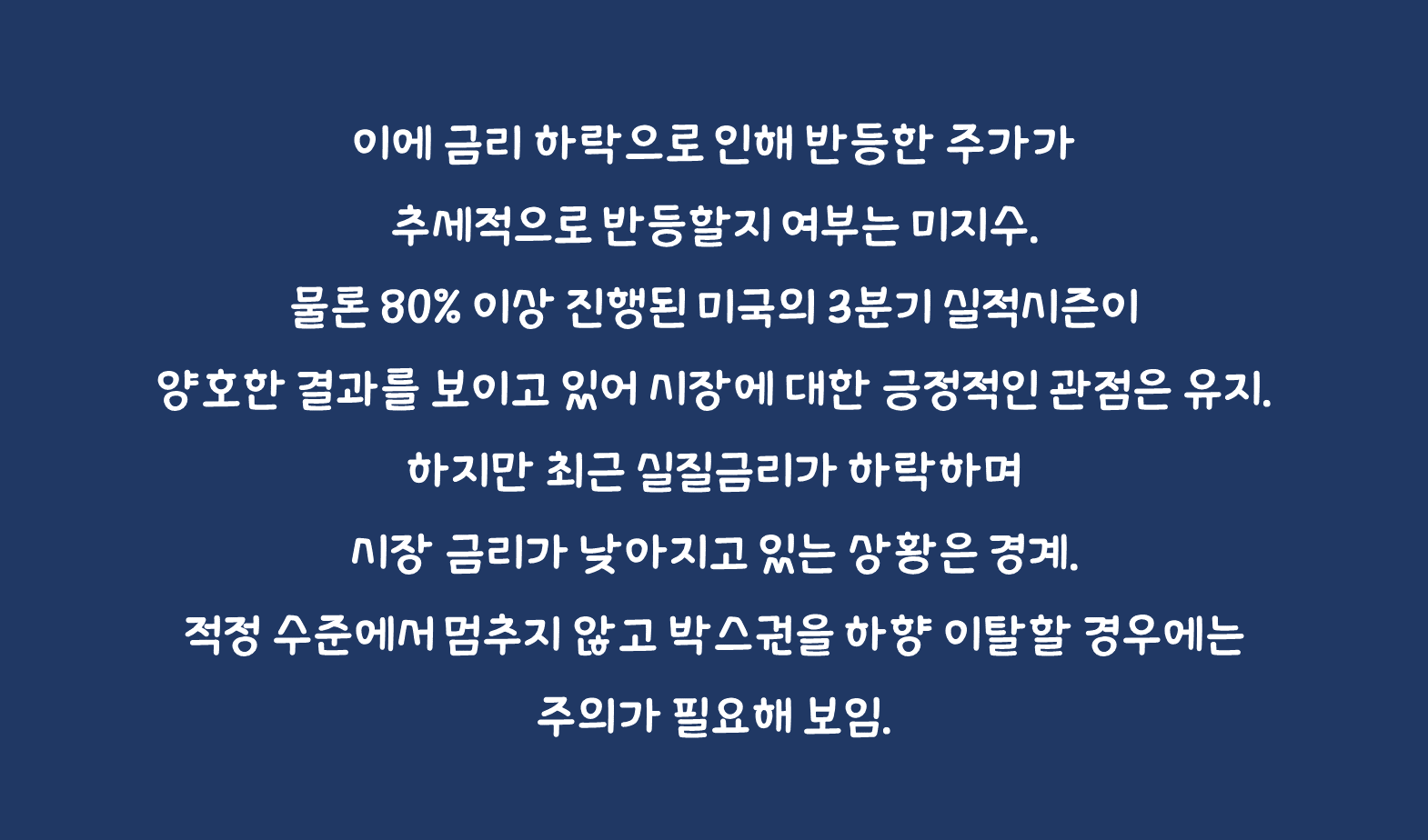 • 게다가 전미 자동차 노조의 파업이 ISM 제조업 및 고용지표 같은 경제지표에 영향을 미치며 해석에 어려움을 준 점도 감안할 필요가 있음. 이에 금리 하락으로 인해 반등한 주가가 추세적으로 반등할지 여부는 미지수. 물론 80% 이상 진행된 미국의 3분기 실적시즌이 양호한 결과를 보이고 있어 시장에 대한 긍정적인 관점은 유지.