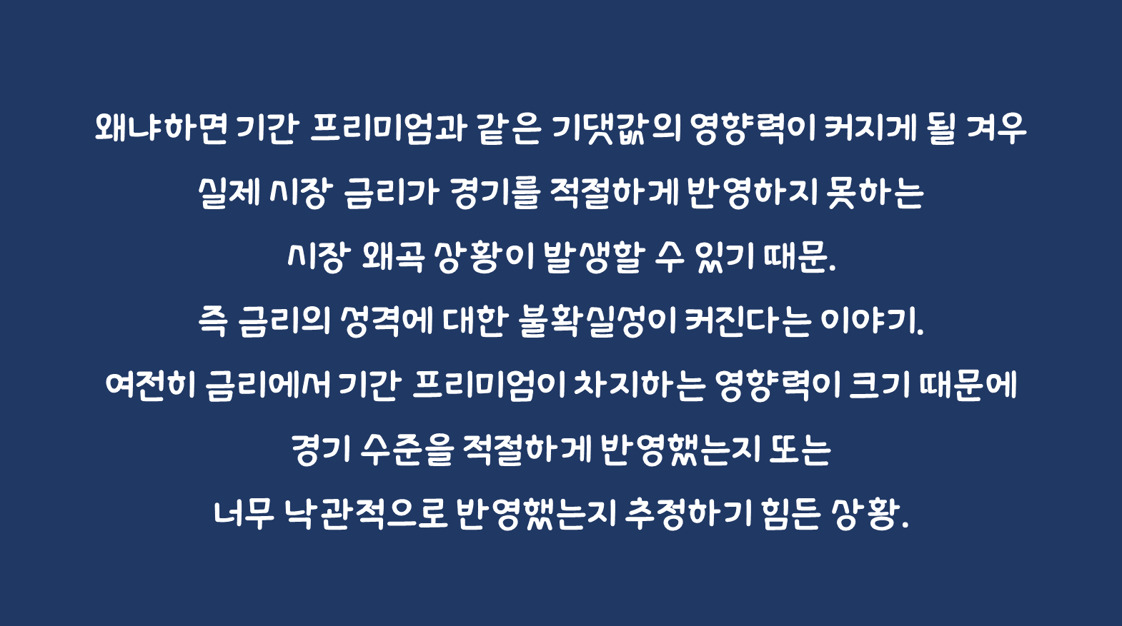 • 왜냐하면 기간 프리미엄과 같은 기댓값의 영향력이 커지게 될 겨우 실제 시장 금리가 경기를 적절하게 반영하지 못하는 시장 왜곡 상황이 발생할 수 있기 때문. 즉 금리의 성격에 대한 불확실성이 커진다는 이야기. 연준 위원들도 기간 프리미엄 상승에 따른 장기 금리의 상승을 경계하는 듯한 발언을 하기도.