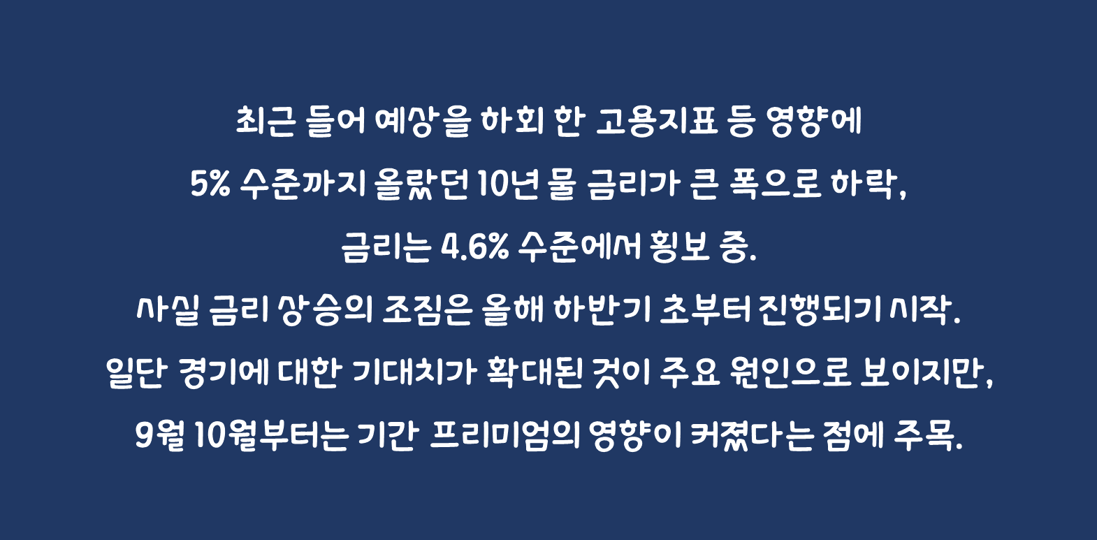 • 최근 들어 예상을 하회 한 고용지표 등 영향에 5% 수준까지 올랐던 10년 물 금리가 큰 폭으로 하락, 간밤에 일부분 되돌림이 나타나며 금리는 4.6% 수준에서 횡보 중.