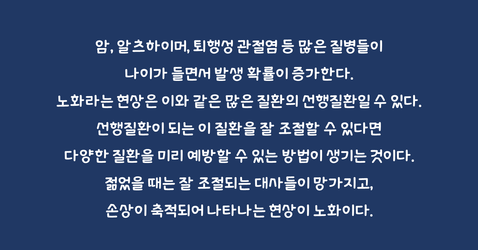 노화는 다양하고 복합적인 요인과 기전이 포함되어 있다. 또한 윤리적인 문제들로 인해 인간에 적용하여 임상 시험을 하는 것이 쉽지 않다. 최종적으로 노화 치료제가 상업화된다고 가정했을 때, 불평등 문제를 야기할 수 있다. 하지만 이는 미래의 일이다. 암, 알츠하이머, 퇴행성 관절염 등 많은 질병들이 나이가 들면서 발생 확률이 증가한다. 노화라는 현상은 이와 같은 많은 질환의 선행질환일 수 있다. 선행질환이 되는 이 질환을 잘 조절할 수 있다면 다양한 질환을 미리 예방할 수 있는 방법이 생기는 것이다.
