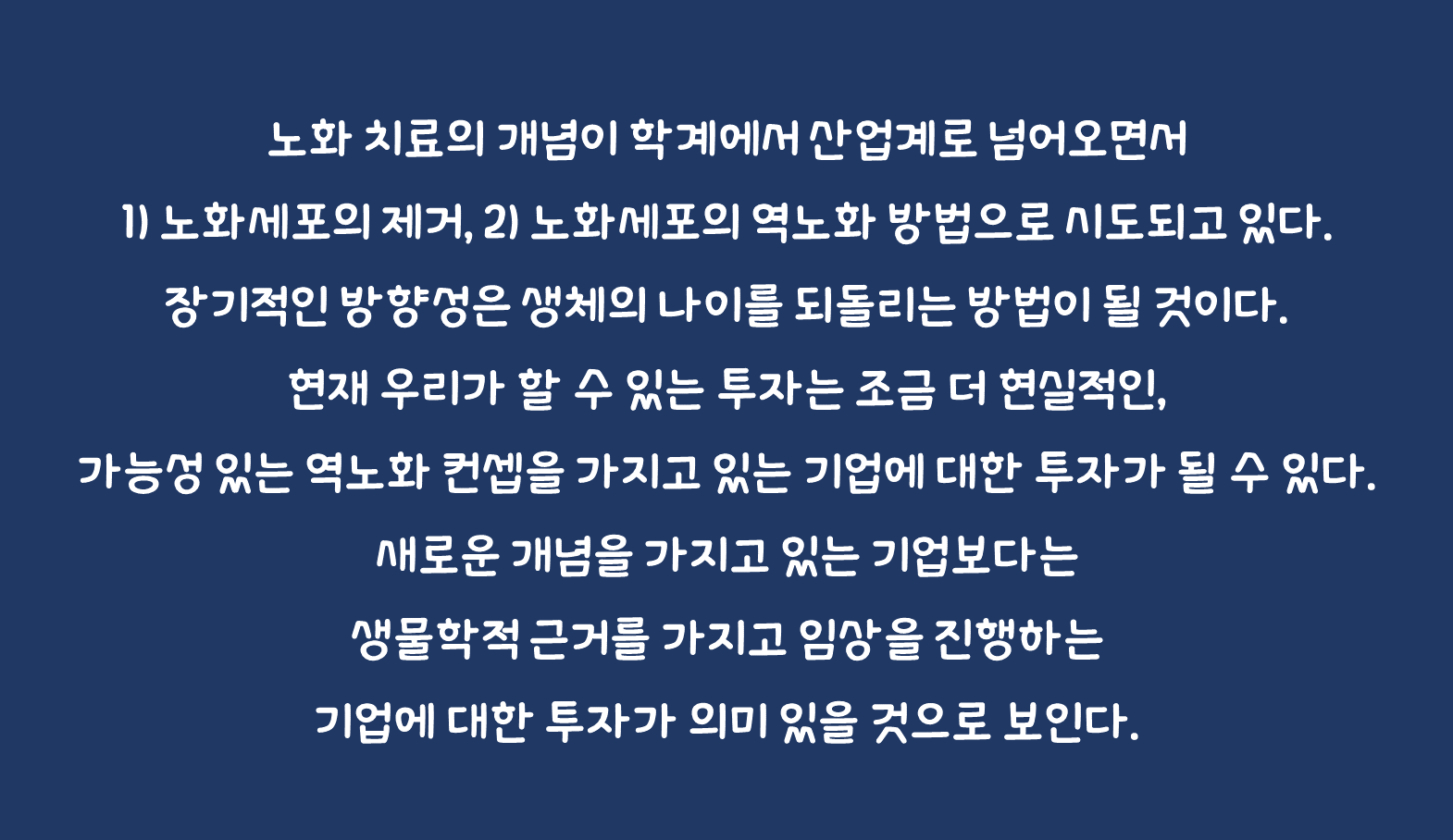 현실적으로 당장은 많은 사람들이 화장품이나 의료기기를 통해 노화를 지연시키는 방법을 택하고 있다. 하지만 장기적인 방향성은 생체의 나이를 되돌리는 방법이 될 것이다. 현재 우리가 할 수 있는 투자는 조금 더 현실적인, 가능성 있는 역노화 컨셉을 가지고 있는 기업에 대한 투자가 될 수 있다. 본 보고서에서는 다양한 노화 치료의 컨셉을 가지고 있는 기업들을 정리하였다. 새로운 개념을 가지고 있는 기업보다는 생물학적 근거를 가지고 임상을 진행하는 기업에 대한 투자가 의미 있을 것으로 보인다.