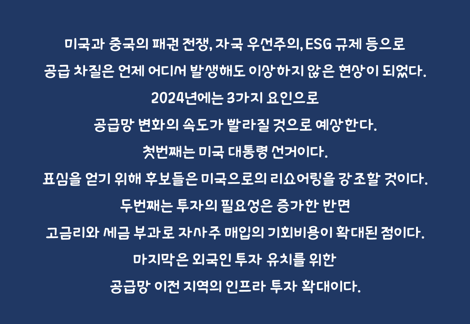 2024년에는 3가지 요인으로 공급망 변화의 속도가 빨라질 것으로 예상한다. 첫번째는 미국 대통령 선거이다. 2016년 트럼프의 승리를 이끈 러스트 벨트가 재차 이번 선거 결과의 키를 쥐고 있다. 표심을 얻기 위해 후보들은 미국으로의 리쇼어링을 강조할 것이다. 두번째는 투자의 필요성은 증가한 반면 고금리와 세금 부과로 자사주 매입의 기회비용이 확대된 점이다. 마지막은 외국인 투자 유치를 위한 공급망 이전 지역의 인프라 투자 확대이다. 인도, 베트남 보다 일찍이 외국인들의 투자가 이뤄진 멕시코조차 인프라 부족으로 인한 운송 차질이 나타나고 있다. 멕시코 정부는 내년 예산 중 경제 부분의 60% 이상을 에너지, 교통 인프라 구축에 할당하였다.