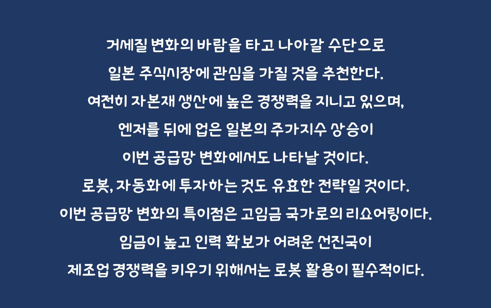 거세질 변화의 바람을 타고 나아갈 수단으로 일본 주식시장에 관심을 가질 것을 추천한다. 오프쇼어링 붐이 일었던 2000년대 초 주식시장이 크게 상승했던 국가는 중국 산업화에 필요한 물품을 수출한 일본, 한국, 독일이었다. 여전히 자본재 생산에 높은 경쟁력을 지니고 있으며, 엔저를 뒤에 업은 일본의 주가지수 상승이 이번 공급망 변화에서도 나타날 것이다.