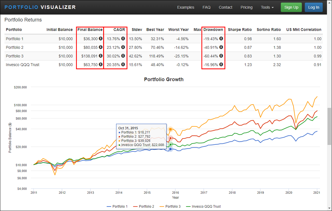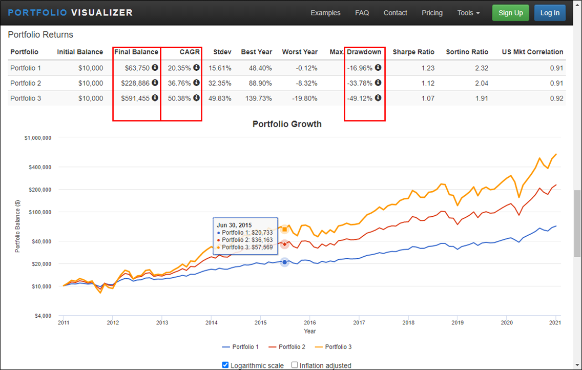 Portfolio Visualizer의 결과 화면에서 Final Balance는 CAGR와 연결된 내용이고 MDD 또한 Sharpe Ratio랑 연결되어 있으므로 Final Balance와 MDD만 비교해 보면 될 것 같습니다. 결론은 같은 MDD 대비 높은 수익을 보이는 전략이 상대적으로 더 우위에 있다고 보겠습니다.