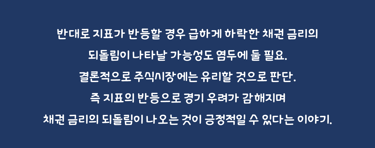 반대로 지표가 반등할 경우 급하게 하락한 채권 금리의 되돌림이 나타날 가능성도 염두에 둘 필요. 두 가지 시나리오에 따라 12월 증시의 내러티브가 결정될 것. 결론적으로 후자의 케이스가 주식시장에는 유리할 것으로 판단. 즉 지표의 반등으로 경기 우려가 감해지며 채권 금리의 되돌림이 나오는 것이 긍정적일 수 있다는 이야기.
