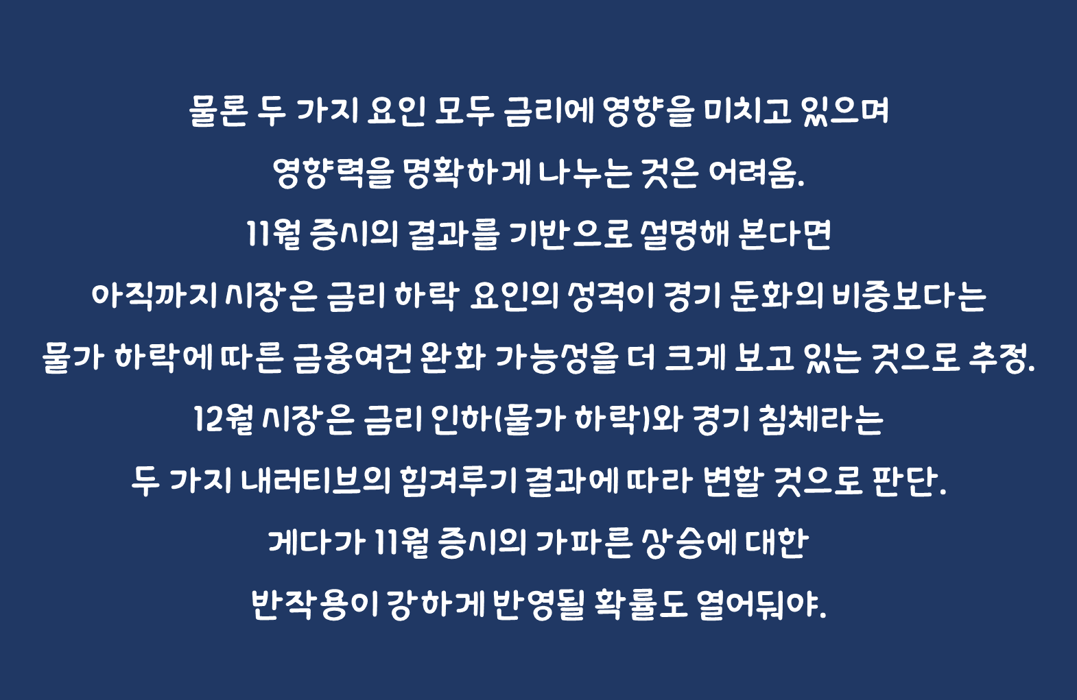 물론 두 가지 요인 모두 금리에 영향을 미치고 있으며 영향력을 명확하게 나누는 것은 어려움. 11월 증시의 결과를 기반으로 설명해 본다면 아직까지 시장은 금리 하락 요인의 성격이 경기 둔화의 비중보다는 물가 하락에 따른 금융여건 완화 가능성을 더 크게 보고 있는 것으로 추정. 그리고 경기 침체에 대비한 보험성 금리 인하 가능성도 일부 반영하고 있는 것으로 보임.