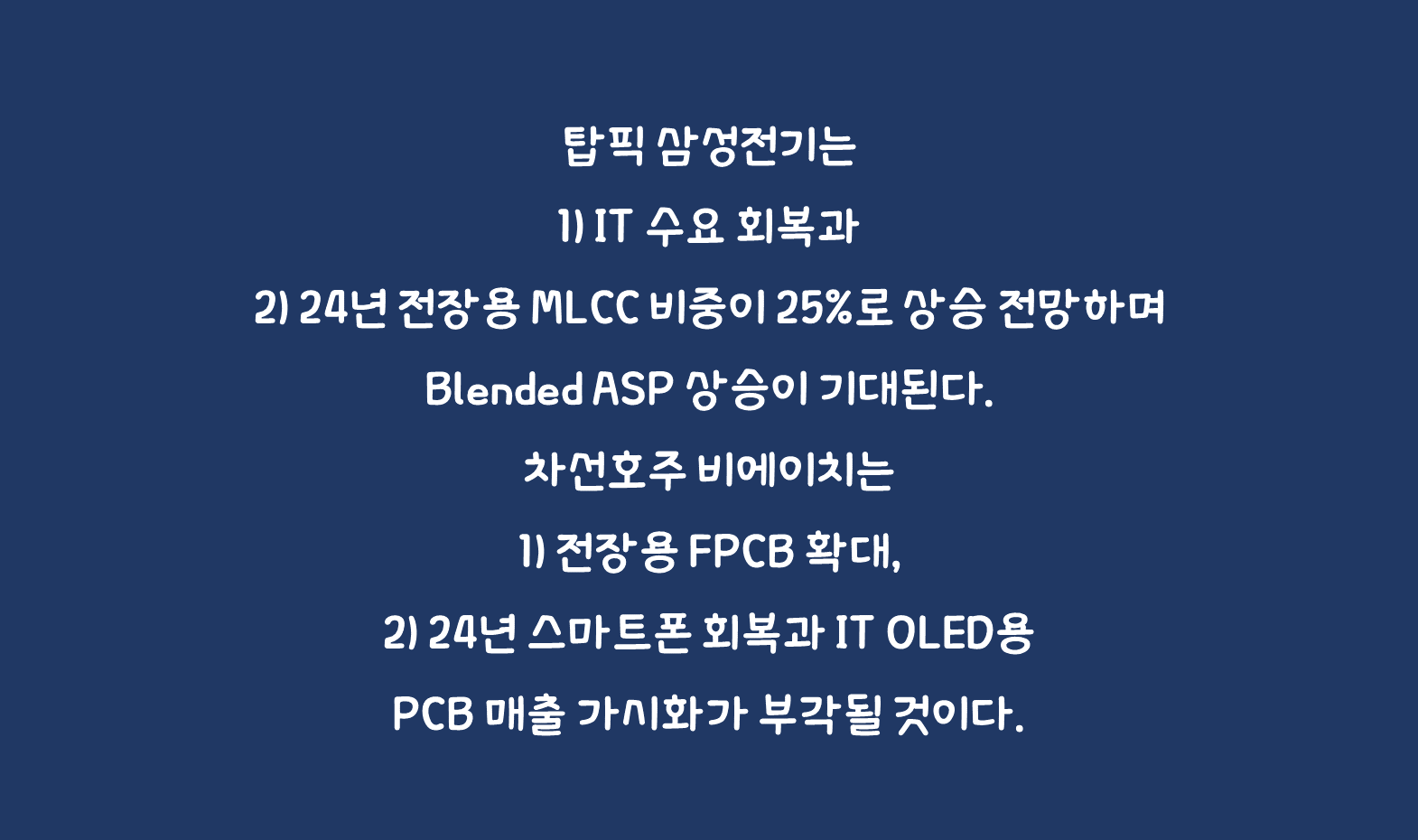 탑픽 삼성전기는 투자의견 매수와 목표주가 190,000원으로 제시한다. 1) IT 수요 회복과 2) 24년 전장용 MLCC 비중이 25%로 상승 전망하며 Blended ASP 상승이 기대된다. 차선호주 비에이치는 투자의견 매수와 목표주가 30,000원으로 제시한다. 1) 전장용 FPCB 확대, 2) 24년 스마트폰 회복과 IT OLED용 PCB 매출 가시화가 부각될 것이다.