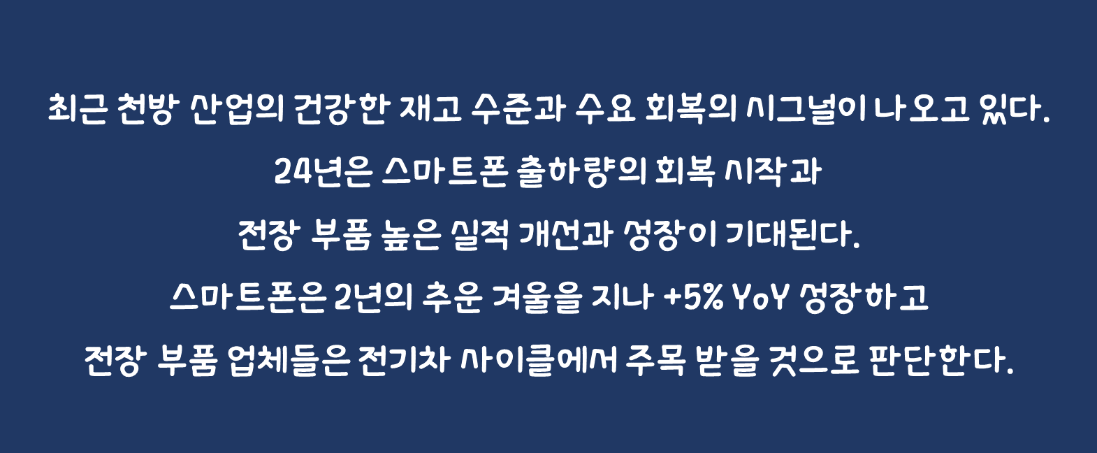전기전자/IT 하드웨어에 대해 비중확대로 신규 커버리지를 개시한다. 최근 천방 산업의 건강한 재고 수준과 수요 회복의 시그널이 나오고 있다. 24년은 스마트폰 출하량의 회복 시작과 전장 부품 높은 실적 개선과 성장이 기대된다. 스마트폰은 2년의 추운 겨울을 지나 +5% YoY 성장하고 전장 부품 업체들은 전기차 사이클에서 주목 받을 것으로 판단한다. 성장성 대비 초기 전기차 전장 신규 진입에 마진이 보장되지 않았으나 명확한 수익 창출의 비즈니스로 변화하는 한 해가 될 것이다.