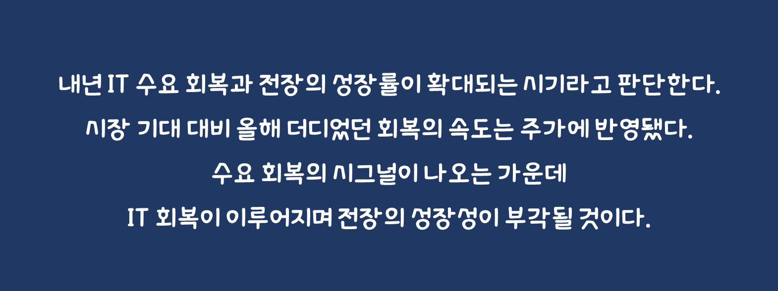 내년 IT 수요 회복과 전장의 성장률이 확대되는 시기라고 판단한다. 시장 기대 대비 올해 더디었던 회복의 속도는 주가에 반영됐다. 전방 산업들의 모바일 및 PC 재고 완화의 기조가 이어지고 있다. 수요 회복의 시그널이 나오는 가운데 IT 회복이 이루어지며 전장의 성장성이 부각될 것이다.