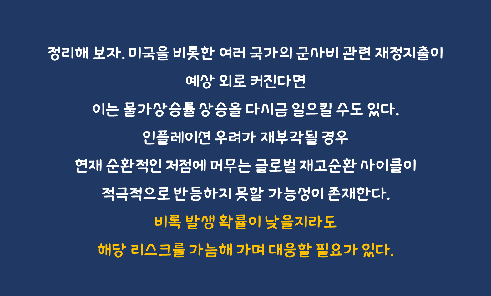 정리해 보자. 미국을 비롯한 여러 국가의 군사비 관련 재정지출이 예상 외로 커진다면 이는 물가상승률 상승을 다시금 일으킬 수도 있다. 인플레이션 우려가 재부각될 경우 현재 순환적인 저점에 머무는 글로벌 재고순환 사이클이 적극적으로 반등하지 못할 가능성이 존재한다. 비록 발생 확률이 낮을지라도 해당 리스크를 가늠해 가며 대응할 필요가 있다.