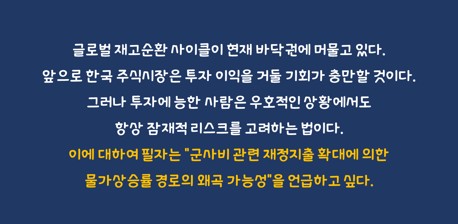 한국 주식시장을 전망하면서 가장 중요한 것을 고르라면 단연 글로벌 재고순환 사이클이다. 만약, 이 것이 순환적인 저점에 위치하면 향후 주식시장은 상승을 기대해 볼 수 있다. 반면, 이것이 순환적인 고점에 이르렀을 경우 다가올 주식시장은 하락의 가능성에 대비해야 한다. 다행스럽게도 지금은 전자에 해당한다. 글로벌 재고순환 사이클이 현재 바닥권에 머물고 있다. 앞으로 한국 주식시장은 투자 이익을 거둘 기회가 충만할 것이다. 그러나 투자에 능한 사람은 우호적인 상황에서도 항상 잠재적 리스크를 고려하는 법이다. 투자자는 발생 가능성이 작아도 향후 문제를 일으킬 수 있는 위험 요인이 무엇인 지 따져 보는 습관을 지녀야 한다. 이에 대하여 필자는 "군사비 관련 재정지출 확대에 의한 물가상승률 경로의 왜곡 가능성"을 언급하고 싶다.