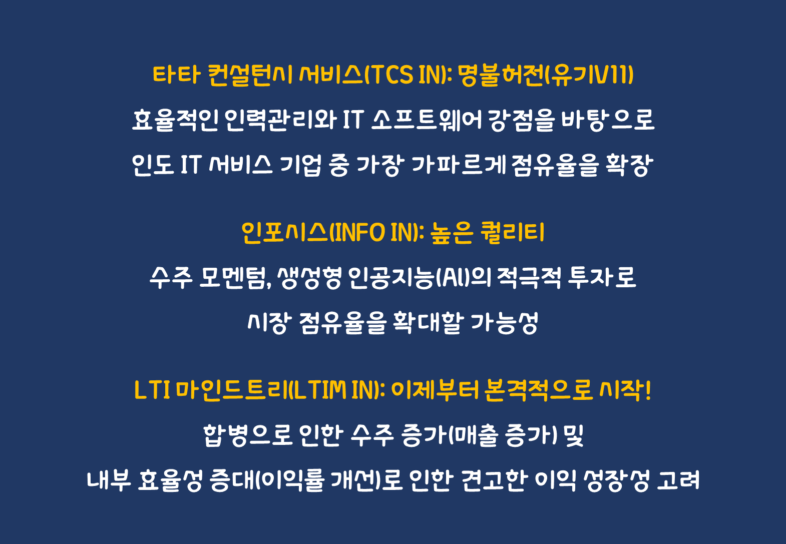 향후 인도 IT 서비스 업종은 글로벌 IT 서비스 시장의 구조적 성장과 인도 개별 기업들의 확실한 경제적 해자(원가 경쟁력을 갖춘 고급 IT 인력 소싱 및 관리)를 바탕으로 장 기적으로 초과수익률을 기록할 것으로 판단한다.