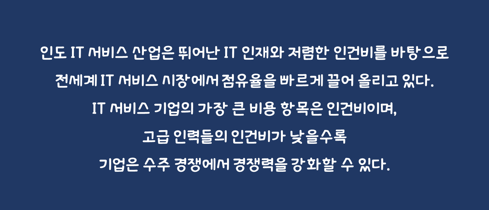 인도 IT 서비스 산업은 뛰어난 IT 인재와 저렴한 인건비를 바탕으로 전세계 IT 서비스 시장에서 점유율을 빠르게 끌어올리고 있다. 글로벌 상위 25개 IT 서비스 기업 기준 인도 IT 서비스 기업들의 합산 시장 점유율(매출액 기준)은 2010년 5.7%에서 2022년 17.3%까지 증가했다. IT 서비스 기업의 가장 큰 비용 항목은 인건비이며, 고급 인력들의 인건비가 낮을수록 기업은 수주 경쟁에서 경쟁력을 강화할 수 있다. 타타 컨설턴시의 인건비는 연간 2.4만달러/명으로 미국, 프랑스 기업들의 3.5만~5.8만 달러/명 대비 현저히 낮다. 향후에도 인도 고급 IT 인력들의 임금 경쟁력은 지속되어, 인도 IT 서비스 산업의 매출액 기준 시장 점유율은 FY27년 20%까지 상승할 것으로 전망한다.