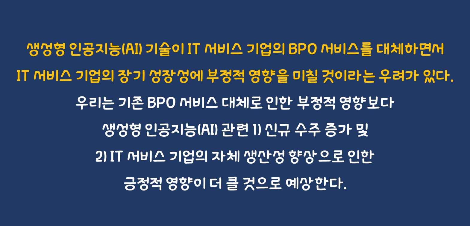 생성형 인공지능(AI) 기술이 IT 서비스 기업의 BPO 서비스를 대체하면서 IT 서비스 기업의 장기 성장성에 부정적 영향을 미칠 것이라는 우려가 있다. 우리는 기존 BPO 서비스 대체로 인한 부정적 영향보다 생성형 인공지능(AI) 관련 1) 신규 수주 증가 및 2) IT 서비스 기업의 자체 생산성 향상으로 인한 긍정적 영향이 더 클 것으로 예상한다. 우리의 민감도 분석에 따르면, 생성형 인공지능(Al) 시장 성장으로 인도 주요 IT 서비스 기업들의 영업이익은 평균 7.3% 증가할 것으로 예상하는데(FY26년 기준), 이는 아직 시장 컨센서스에는 온전히 반영되어 있지 않다.