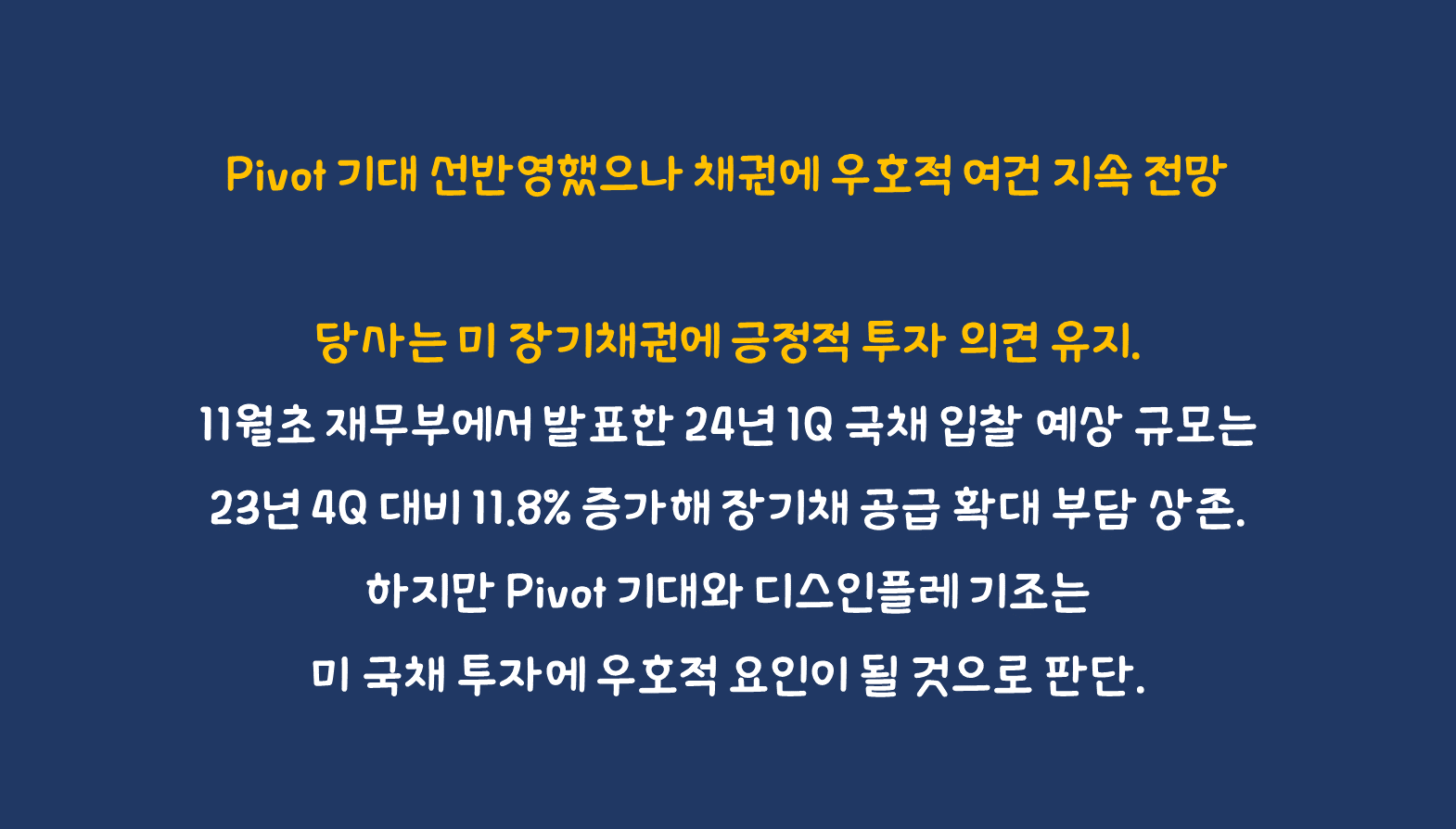 당사는 미 장기채권에 긍정적 투자 의견 유지. 11월초 재무부에서 발표한 24년 1Q 국채 입찰 예상 규모는 23년 4Q 대비 11.8% 증가해 장기채 공급 확대 부담 상존. 하지만 Pivot 기대와 디스인플레 기조는 미 국채 투자에 우호적 요인이 될 것으로 판단. 한국은 고금리 영향에 저성장 부담이 심화되고 있는 상황에서 크레딧 이벤트 추가 발생 경계심은 금통위 인하 시점을 앞당길 요인. 내수 위축 흐름 고려할 때 국내 금리 상승 여력 제한적. 3%대 국고채 금리는 잠재 수준 대비 여전히 높은 레벨로 판단.