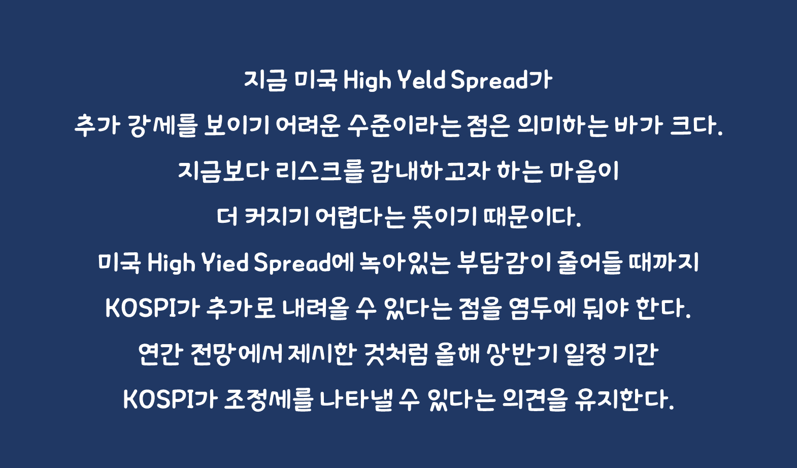 그렇다면 지금 미국 High Yeld Spread가 추가 강세를 보이기 어려운 수준이라는 점은 의미하는 바가 크다. 지금보다 리스크를 감내하고자 하는 마음이 더 커지기 어렵다는 뜻이기 때문이다. 이는 KOSPI에도 동일하게 적용할 수 있다. 엄밀하게 말하면 이러한 현상은 이미 지난 1월 3일부터 KOSPI에 묻어나기 시작했다. 미국 High Yied Spread에 녹아있는 부담감이 줄어들 때까지 KOSPI가 추가로 내려올 수 있다는 점을 염두에 둬야 한다. 연간 전망에서 제시한 것처럼, 올해 상반기 일정 기간 KOSPI가 조정세를 나타낼 수 있다는 의견을 유지한다.