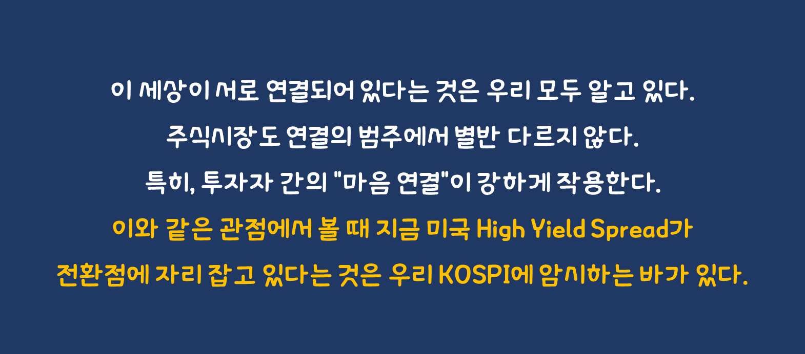 이 세상이 서로 연결되어 있다는 것은 우리 모두 알고 있다. 크게는 상대성 이론 아래에서 거시적 성계가 구부러진 공간을 따라 움직이고, 작게는 양자학 아래에서 미시적 물질이 확률적으로 상호 간섭 한다. 주식시장도 연결의 범주에서 별반 다르지 않다. 특히, 투자자 간의 "마음 연결"이 강하게 작용한다. 이와 같은 관점에서 볼 때 지금 미국 High Yield Spread가 전환점에 자리 잡고 있다는 것은 우리 KOSPI에 암시하는 바가 있다.