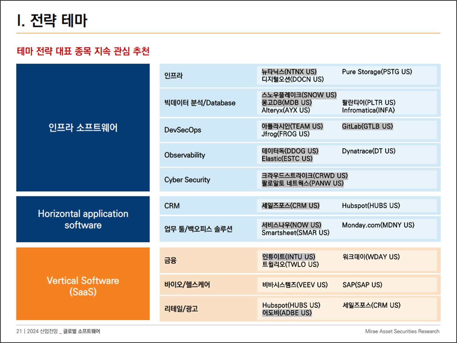 뉴타닉스, 스노우플레이크, 몽고DB, 아틀라시안, Gitlab, 데이터독, Elastic, 크라우드스트라이크, 팔로알토 네트웍스, 세일즈포스, 서비스나우, 인튜이트, 어도비