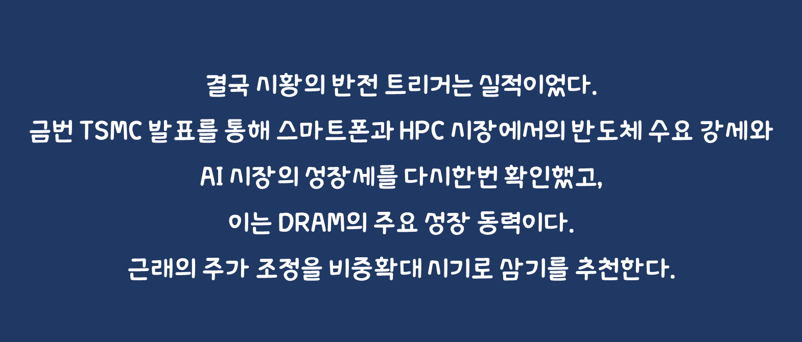 결국 시황의 반전 트리거는 실적이었다. 1월 하반월에 지속되는 반도체 서플라이체인의 견조한 실적과 긍정적인 가이던스는 반도체 업종에 대한 투자 센티먼트를 반전시키는 계기가 될 것이다. 가깝게는 1/25 SK하이닉스, 1/31 삼성전자의 실적발표가 예정되어 있다. 비록, 삼성전자의 잠정실적이 기대에 미치지 못하며 주가하락을 유발했으나, 투자의견의 큰 변화가 없다. 실적 부진의 주요 원인이 핵심 투자포인트인 DRAM 사업에 있지 않다고 판단했기 때문이다. 금번 TSMC 발표를 통해 스마트폰과 HPC 시장에서의 반도체 수요 강세와 AI 시장의 성장세를 다시한번 확인했고, 이는 DRAM의 주요 성장 동력이다. 근래의 주가 조정을 비중확대 시기로 삼기를 추천한다.