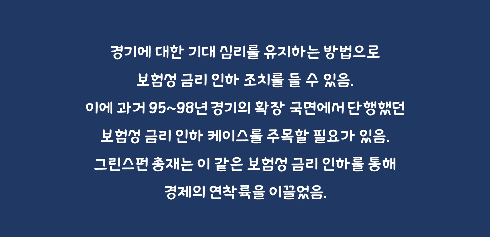 인플레이션에 대한 기대 심리가 실제 인플레이션의 경로를 만들어가듯이 경기에 대한 기대 심리를 잘 설정해 놓는 것도 실제 경기에 영향을 미칠 수 있음. 경기에 대한 기대 심리를 유지하는 방법으로 보험성 금리 인하 조치를 들 수 있음. 이에 과거 95~98년 경기의 확장 국면에서 단행했던 보험성 금리 인하 케이스를 주목할 필요가 있음.