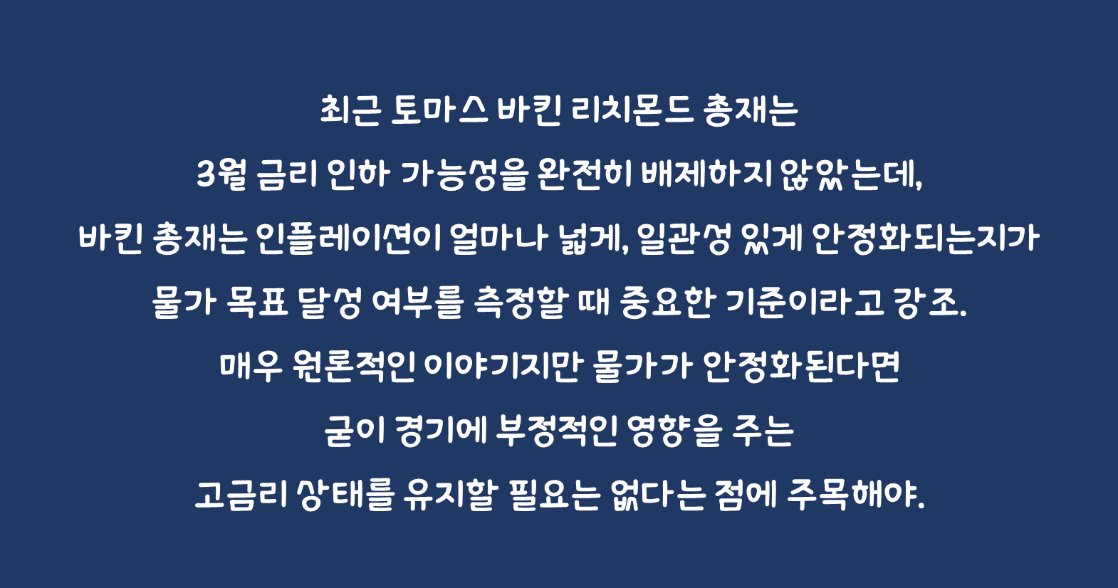 최근 토마스 바킨 리치몬드 총재는 3월 금리 인하 가능성을 완전히 배제하지 않았는데, 바킨 총재는 인플레이션이 얼마나 넓게, 일관성 있게 안정화되는지가 물가 목표 달성 여부를 측정할 때 중요한 기준이라고 강조.