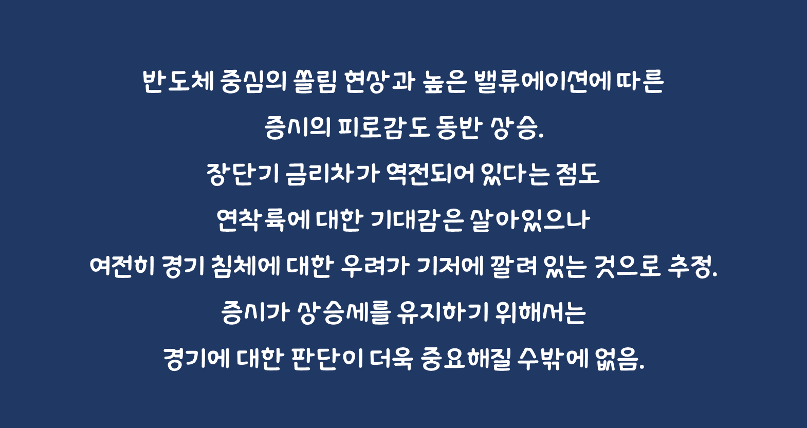 하지만 반도체 중심의 쏠림 현상과 높은 밸류에이션에 따른 증시의 피로감도 동반 상승. 게다가 장단기 금리차가 역전되어 있다는 점도 연착륙에 대한 기대감은 살아있으나 여전히 경기 침체에 대한 우려가 기저에 깔려 있는 것으로 추정. 증시가 상승세를 유지하기 위해서는 경기에 대한 판단이 더욱 중요해질 수밖에 없음.