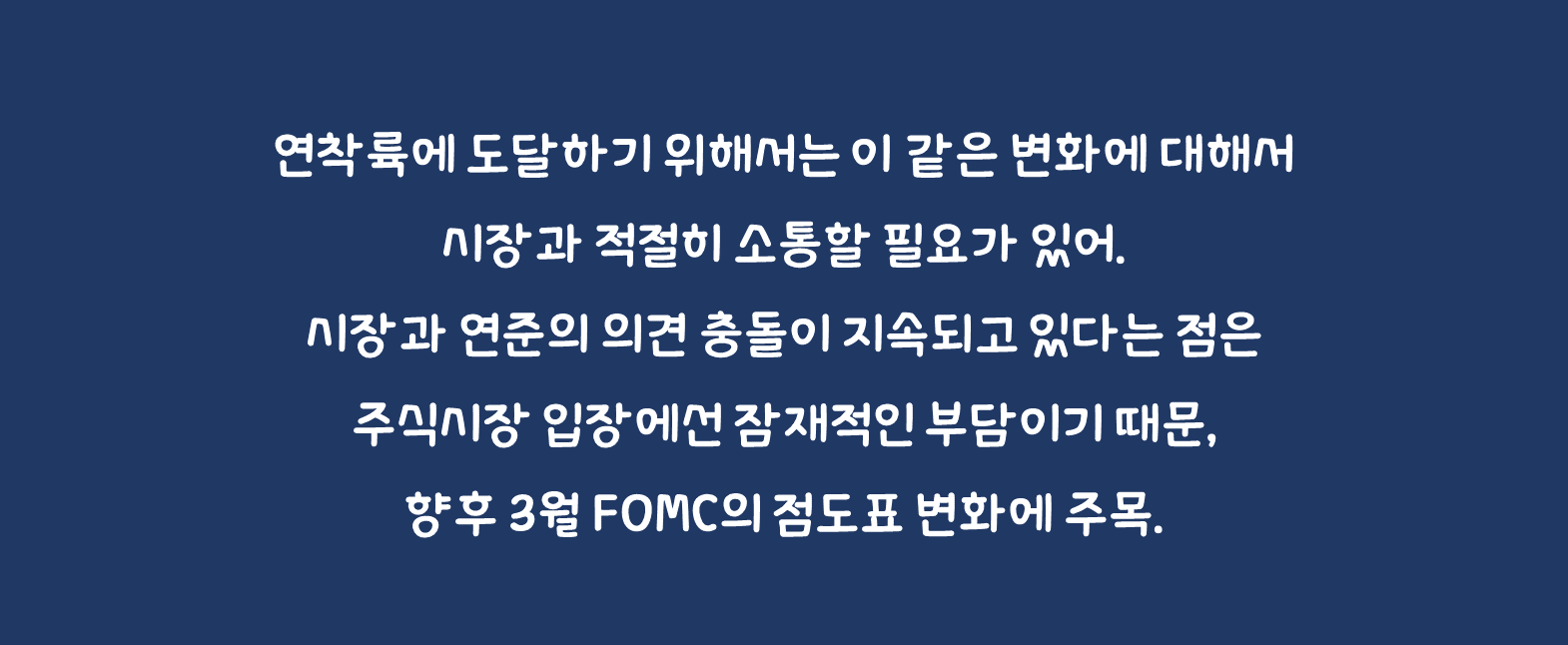 연착륙에 도달하기 위해서는 이 같은 변화에 대해서 시장과 적절히 소통할 필요가 있어. 시장과 연준의 의견 충돌이 지속되고 있다는 점은 주식시장 입장에선 잠재적인 부담이기 때문, 파월 의장은 1월 FOMC 연설에서 정확한 중립금리를 추정하기 어렵다고 언급했지만, 그렇다고 하더라도 어느 정도 기준을 밝힐 필요가 있다는 판단. 향후 3월 FOMC의 점도표 변화에 주목.