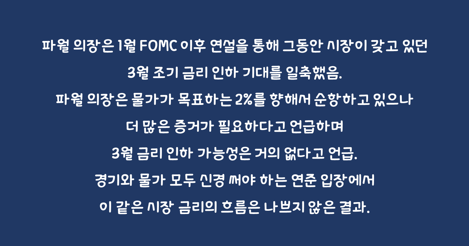 파월 의장은 1월 FOMC 이후 연설을 통해 그동안 시장이 갖고 있던 3월 조기 금리 인하 기대를 일축했음. 파월 의장은 물가가 목표하는 2%를 향해서 순항하고 있으나 더 많은 증거가 필요하다고 언급하며 3월 금리 인하 가능성은 거의 없다고 언급.