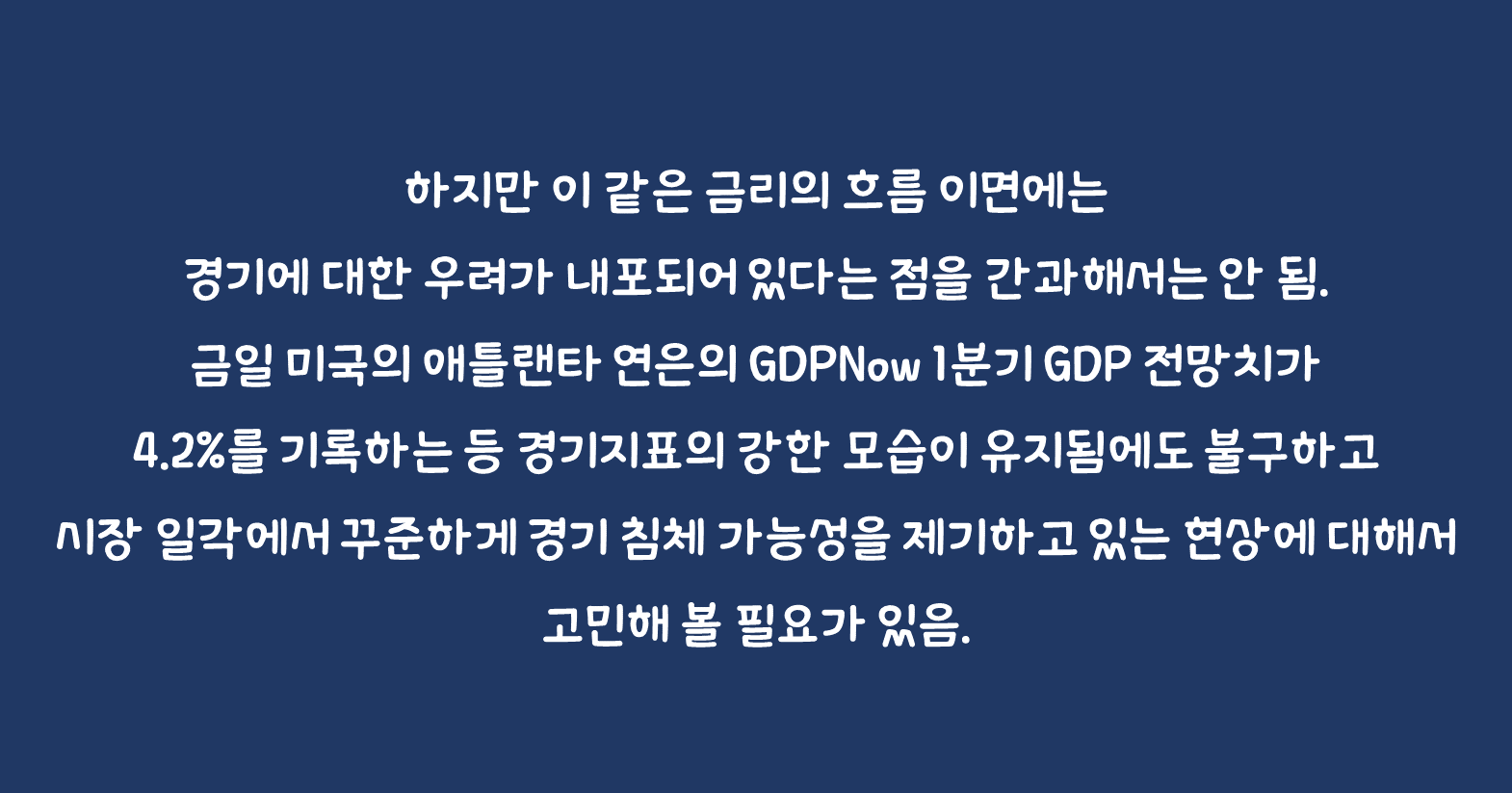 하지만 이 같은 금리의 흐름 이면에는 경기에 대한 우려가 내포되어 있다는 점을 간과해서는 안 됨. 금일 미국의 애틀랜타 연은의 GDPNow 1분기 GDP 전망치가 4.2%를 기록하는 등 경기지표의 강한 모습이 유지됨에도 불구하고 시장 일각에서 꾸준하게 경기 침체 가능성을 제기하고 있는 현상에 대해서 고민해 볼 필요가 있음.