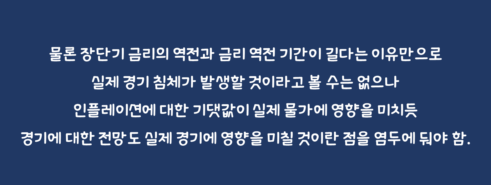 물론 장단기 금리의 역전과 금리 역전 기간이 길다는 이유만으로 실제 경기 침체가 발생할 것이라고 볼 수는 없으나 인플레이션에 대한 기댓값이 실제 물가에 영향을 미치듯 경기에 대한 전망도 실제 경기에 영향을 미칠 것이란 점을 염두에 둬야 함.