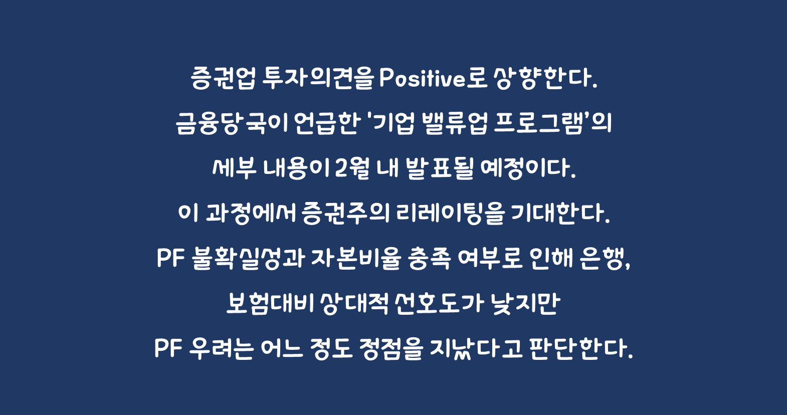 증권업 투자의견을 Positive로 상향한다. 금융당국이 언급한 '기업 밸류업 프로그램'의 세부 내용이 2월 내 발표될 예정이다. 기업 스스로 저평가 이유 분석 및 대응전략 마련이 목적인데 대표적으로 저 PBR 업종의 배당 확대 혹은 자사주 매입•소각을 기대하고 있다. 올해 금융위의 주요 업무 추진과제 중 하나이고, 기업가치 제고에 대한 논의인 만큼 일회성 테마가 아닌 중장기적으로 주주환원책이 자리 잡는 계기가 될 가능성이 크다.