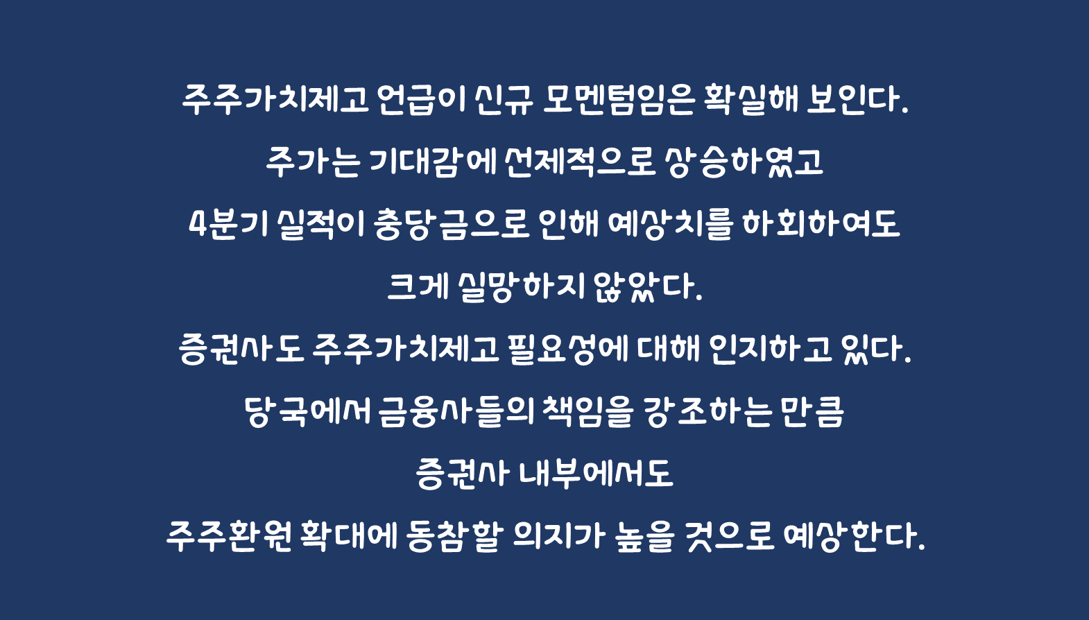 주주가치제고 언급이 신규 모멘텀임은 확실해 보인다. 주가는 기대감에 선제적으로 상승하였고 4분기 실적이 충당금으로 인해 예상치를 하회하여도 크게 실망하지 않았다. 오히려 빠르게 정상화되는 과정으로 받아들여 긍정적으로 평가하는 의견이 존재한다. 참고로 주요 증권사들은 올해 상반기까지는 해외대체자산 관련 손실을 인식할 여지는 있으나 4 분기 수준의 규모는 아닐 것으로 파악된다.