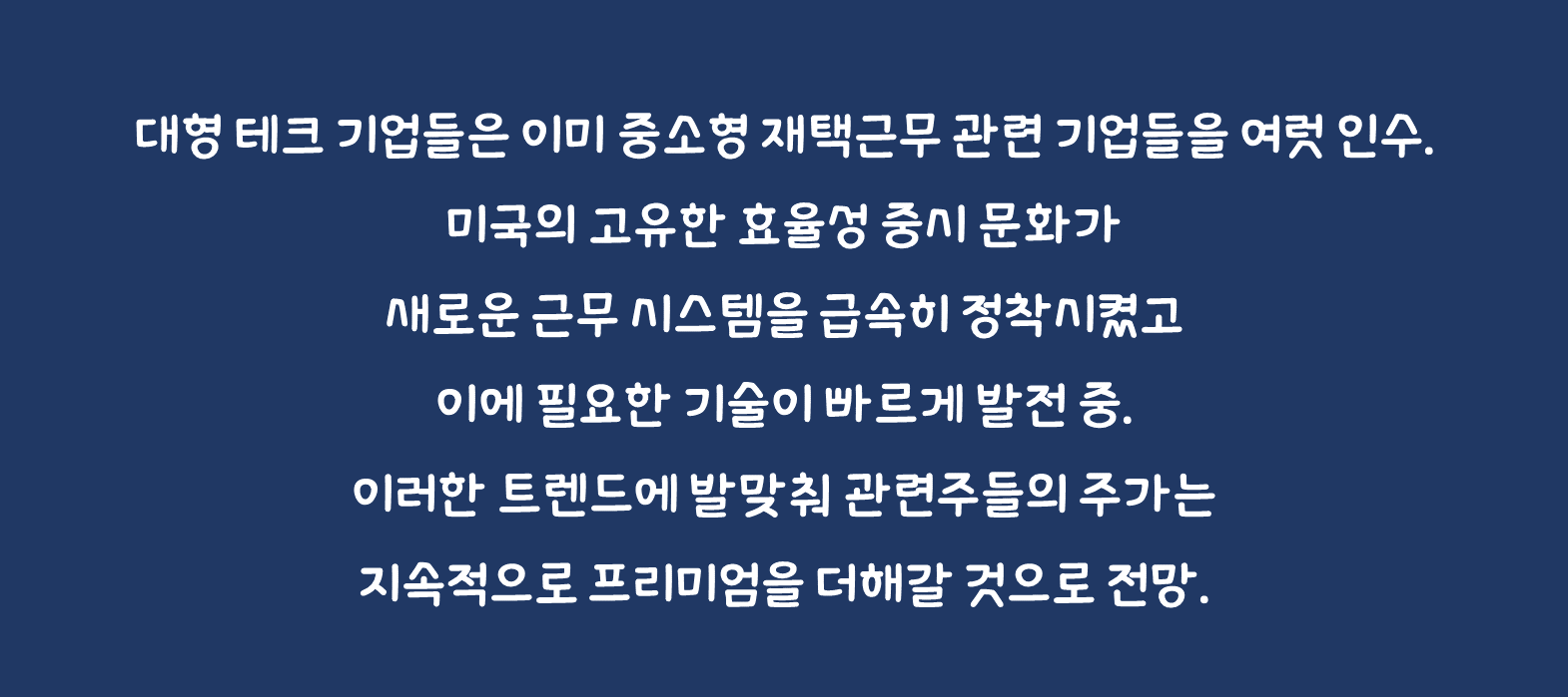 미국 기업들은 부분 재택근무 시스템을 이미 도입 중. 특히 정보기술, 금융, 엔터, 전문서비스, 부동산 등 서비스 직종을 중심으로 하이브리드 재택근무 비중이 높아. 대형 테크 기업들은 이미 중소형 재택근무 관련 기업들을 여럿 인수. 미국의 고유한 효율성 중시 문화가 새로운 근무 시스템을 급속히 정착시켰고 이에 필요한 기술이 빠르게 발전 중. 이러한 트렌드에 발맞춰 관련주들의 주가는 지속적으로 프리미엄을 더해갈 것으로 전망.