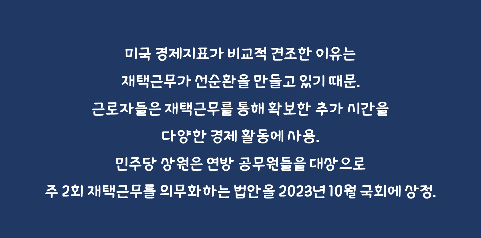 미국 경제지표가 비교적 견조한 이유는 재택근무가 선순환을 만들고 있기 때문. 근로자들은 재택근무를 통해 확보한 추가 시간을 다양한 경제 활동에 사용. 기업들은 최근 재택근무 시스템 구축을 위한 투자를 확대. 미국의 주택 경기는 지속 활황. 주택이 지닌 편하게 쉴 수 있는 휴식처이자 업무 공간으로서의 가치가 더 커지고 있기 때문. 이를 반영해 민주당 상원은 연방 공무원들을 대상으로 주 2회 재택근무를 의무화하는 법안을 2023년 10월 국회에 상정. 바이든 대통령은 연임에 성공하면 이를 핵심 사안으로 추진할 것이라고 발언.