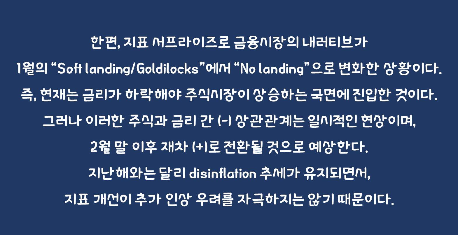 한편, 지표 서프라이즈로 금융시장의 내러티브가 1월의 “Soft landing/Goldilocks”에서 “No landing”으로 변화한 상황이다. 이에 따라, 한동안 (+)를 유지해 온 주식과 금리 간 상관계수가 이번 주 들어 (-)로 전환되었다. 즉, 현재는 금리가 하락해야 주식시장이 상승하는 국면에 진입한 것이다. 그러나 이러한 주식과 금리 간 (-) 상관관계는 일시적인 현상이며, 2월 말 이후 재차 (+)로 전환될 것으로 예상한다. 지난해 2월의 경우, 지표 서프라이즈는 Fed terminal rate의 상향 조정으로 이어져, 국채금리가 단기물 중심으로 급등하였다. 이에 따라, 미국 장단기 금리 역전 폭이 -107bp까지 확대되었다. 그러나, 올해는 장단기 금리가 비슷한 상승 폭을 보이며, 장단기 금리 역전 폭이 -30bp 내외로 유지되고 있다. 지난해와는 달리 disinflation 추세가 유지되면서, 지표 개선이 추가 인상 우려를 자극하지는 않기 때문이다.