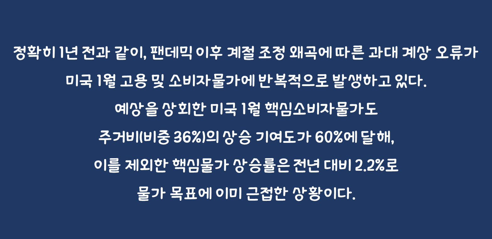 정확히 1년 전과 같이, 팬데믹 이후 계절 조정 왜곡에 따른 과대 계상 오류가 미국 1월 고용 및 소비자물가에 반복적으로 발생하고 있다. 예상을 상회한 미국 1월 핵심소비자물가도 주거비(비중 36%)의 상승 기여도가 60%에 달해, 이를 제외한 핵심물가 상승률은 전년 대비 2.2%로 물가 목표에 이미 근접한 상황이다. 주거비의 경우도 선행지표인 신규 임차인 기준 렌트 상승률이 추세적인 둔화세를 유지하고 있어, 2~3월 중 기존의 둔화 추세로 복귀할 전망이다.