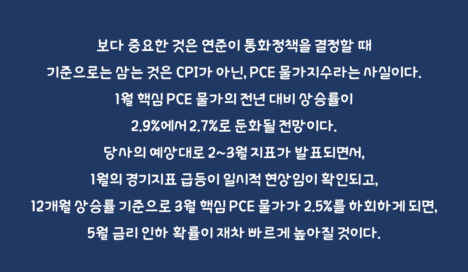 보다 중요한 것은 연준이 통화정책을 결정할 때 기준으로는 삼는 것은 CPI가 아닌, PCE 물가지수라는 사실이다. 1월 CPI 결과를 근거로 당사는 오는 29일 발표 예정인 1월 핵심 PCE 물가가 전월 대비 0.3% 상승할 것으로 전망한다. 지난해 1~3월 핵심 PCE 물가지수는 각각 전월 대비 0.51%, 0.36%, 0.34%씩 상승하여, 월평균 상승률이 0.40%에 달한다. 따라서, 1월 핵심 PCE 물가의 전년 대비 상승률이 2.9%에서 2.7%로 둔화될 전망이다. 당사의 예상대로 2~3월 지표가 발표되면서, 1월의 경기지표 급등이 일시적 현상임이 확인되고, 12개월 상승률 기준으로 3월 핵심 PCE 물가가 2.5%를 하회하게 되면, 5월 금리 인하 확률이 재차 빠르게 높아질 것이다.