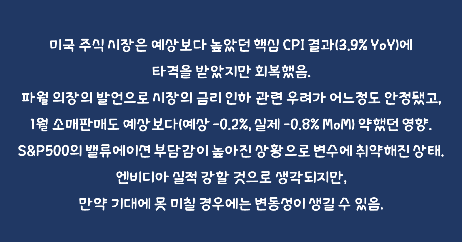 [글로벌 주식] 미국 주식 시장은 예상보다 높았던 핵심 CPI 결과(3.9% YoY)에 타격을 받았지만 회복했음. 파월 의장의 발언으로 시장의 금리 인하 관련 우려가 어느정도 안정됐고, 1월 소매판매도 예상보다(예상 -0.2%, 실제 -0.8% MoM) 약했던 영향. 또한 엔비디아를 비롯한 AI 기업들도 강세를 유지. 금리가 더 오르더라도 여파는 높은 배당 수익률을 지닌 유틸리티, 부동산 섹터와 중소형주에 편향될 가능성이 높음. 다음 주 현지시간 21일에 예정된 엔비디아 실적 발표가 핵심 이벤트. 이제는 미국 시장 시가총액 3위(1.8조달러)에 도달하면서 지수내 절대적인 영향력도 늘어났음. S&P500의 밸류에이션 부담감이 높아진 상황으로 변수에 취약해진 상태. 엔비디아 실적 강할 것으로 생각되지만, 만약 기대에 못 미칠 경우에는 변동성이 생길 수 있음. 컨센서스는 이익(Q4 EPS 4.56, 최고치 5.31), 가이던스(FY2024 매출 59.2B, 최고치 61.7B)에 형성.