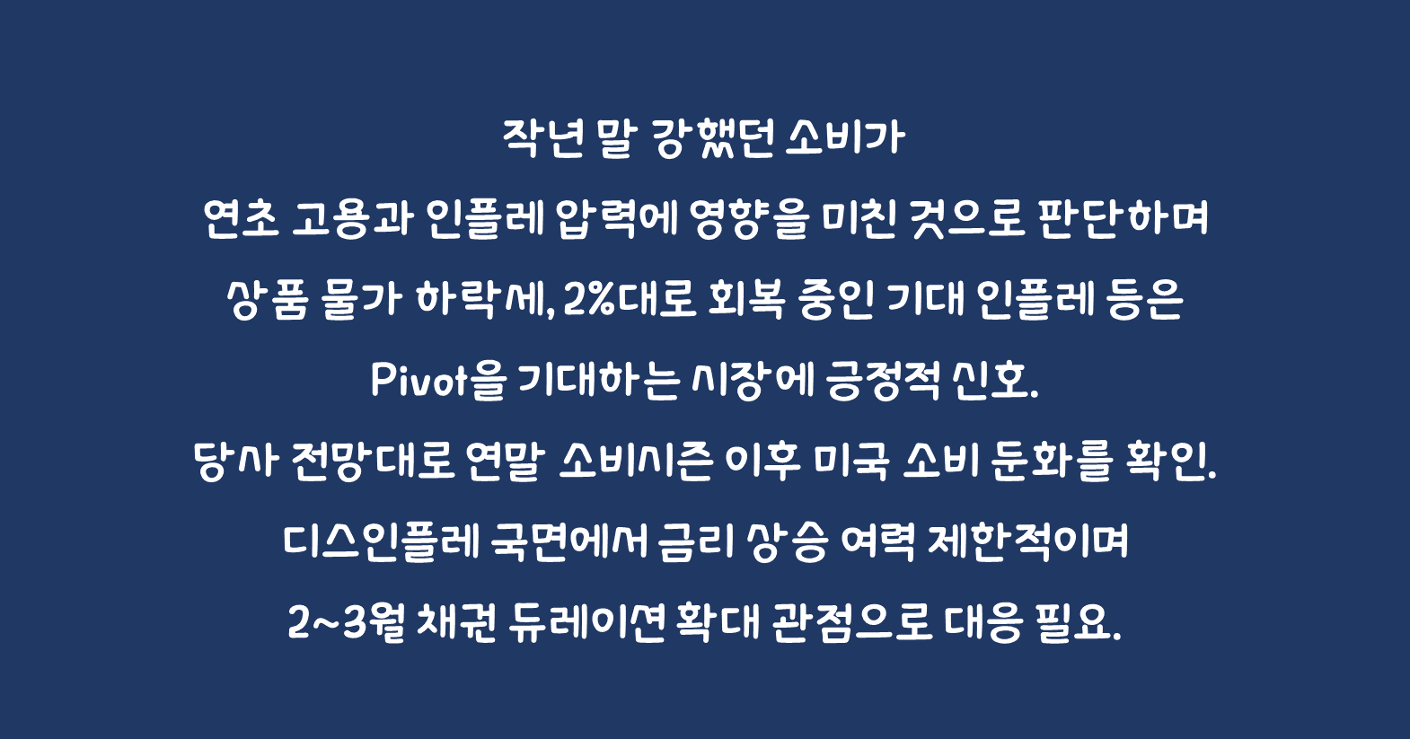 [경제/채권] 미국 1월 코어 CPI는 전월비 +0.4% 기록하며 예상치 상회. 금리 인하 예상 시점이 6월 FOMC로 후퇴하며 미 국채 2년 금리는 연초 이후 최고 수준인 4.6%까지 상승. 작년 말 강했던 소비가 연초 고용과 인플레 압력에 영향을 미친 것으로 판단하며 상품 물가 하락세, 2%대로 회복 중인 기대 인플레 등은 Pivot을 기대하는 시장에 긍정적 신호. 당사 전망대로 연말 소비시즌 이후 미국 소비 둔화를 확인. 1월 FOMC 의사록에서 연준은 금리 인하에 신중한 스탠스를 유지하겠으나 시장의 연내 인하 예상 횟수가 3~4회로 축소된 상황에서 의사록의 매파적 문구가 시장에 미칠 영향은 제한적일 듯. 2월 금통위에서는 금리 동결과 함께 총재는 조기 Pivot 기대를 통제하는 스탠스 유지하겠으나, 상반기 인플레 전망치 2%대 후반으로 하향 조정 전망. 디스인플레 국면에서 금리 상승 여력 제한적이며 2~3월 채권 듀레이션 확대 관점으로 대응 필요.