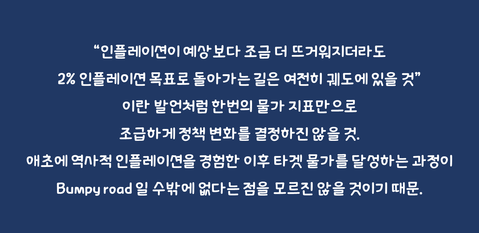 다만 1월 물가 지표 발표 이후 굴스비 총재의 “인플레이션이 예상보다 조금 더 뜨거워지더라도 2% 인플레이션 목표로 돌아가는 길은 여전히 궤도에 있을 것” 이란 발언처럼 한번의 물가 지표만으로 조급하게 정책 변화를 결정하진 않을 것. 애초에 역사적 인플레이션을 경험한 이후 타겟 물가를 달성하는 과정이 Bumpy road 일 수밖에 없다는 점을 모르진 않을 것이기 때문.