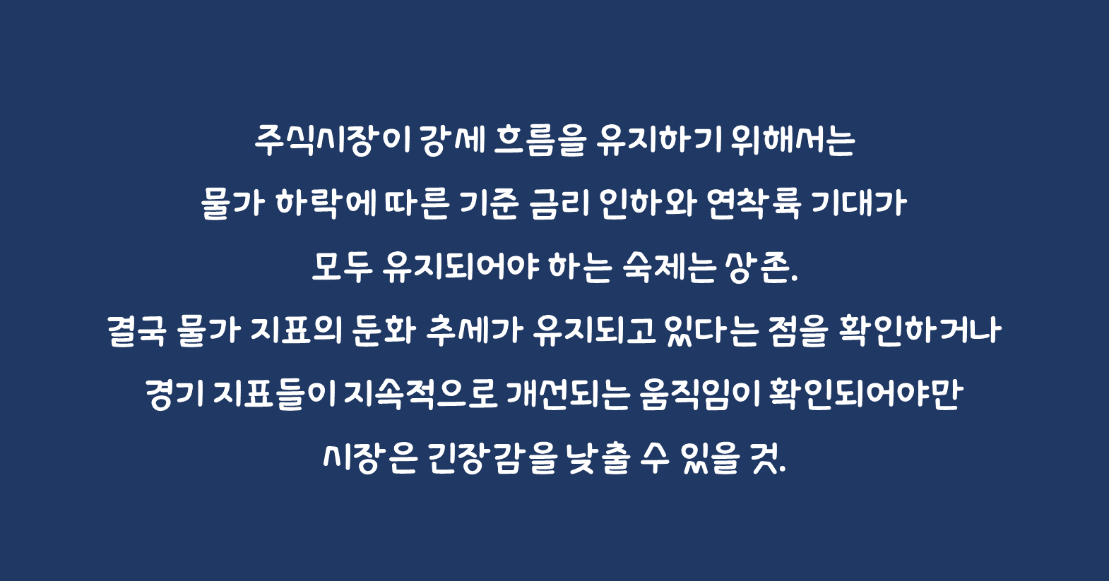 하지만 for Longer 상황이 길어질수록 전술한 Minus spiral 효과에 대한 우려로 인해 연착륙에 대한 시장의 기대가 재조정될 수 있기 때문에 주식시장이 강세 흐름을 유지하기 위해서는 물가 하락에 따른 기준 금리 인하와 연착륙 기대가 모두 유지되어야 하는 숙제는 상존. 결국 물가 지표의 둔화 추세가 유지되고 있다는 점을 확인하거나 경기 지표들이 지속적으로 개선되는 움직임이 확인되어야만 시장은 긴장감을 낮출 수 있을 것.