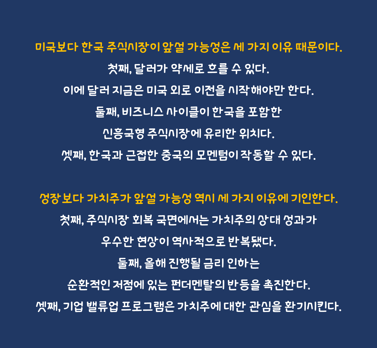 미국보다 한국 주식시장이 앞설 가능성은 세 가지 이유 때문이다. 첫째, 달러가 약세로 흐를 수 있다. 이에 달러 지금은 미국 외로 이전을 시작해야만 한다. 둘째, 비즈니스 사이클이 한국을 포함한 신흥국형 주식시장에 유리한 위치다. 달러 자금이 이곳에 모일 수 있는 환경이 마련된 것이다. 셋째, 한국과 근접한 중국의 모멘텀이 작동할 수 있다. 한국이 중간재 성격의 산업을 다수 가지고 있으므로 한국 주식시장의 상승 베타가 커지며 그 매력이 배가할 수 있다.