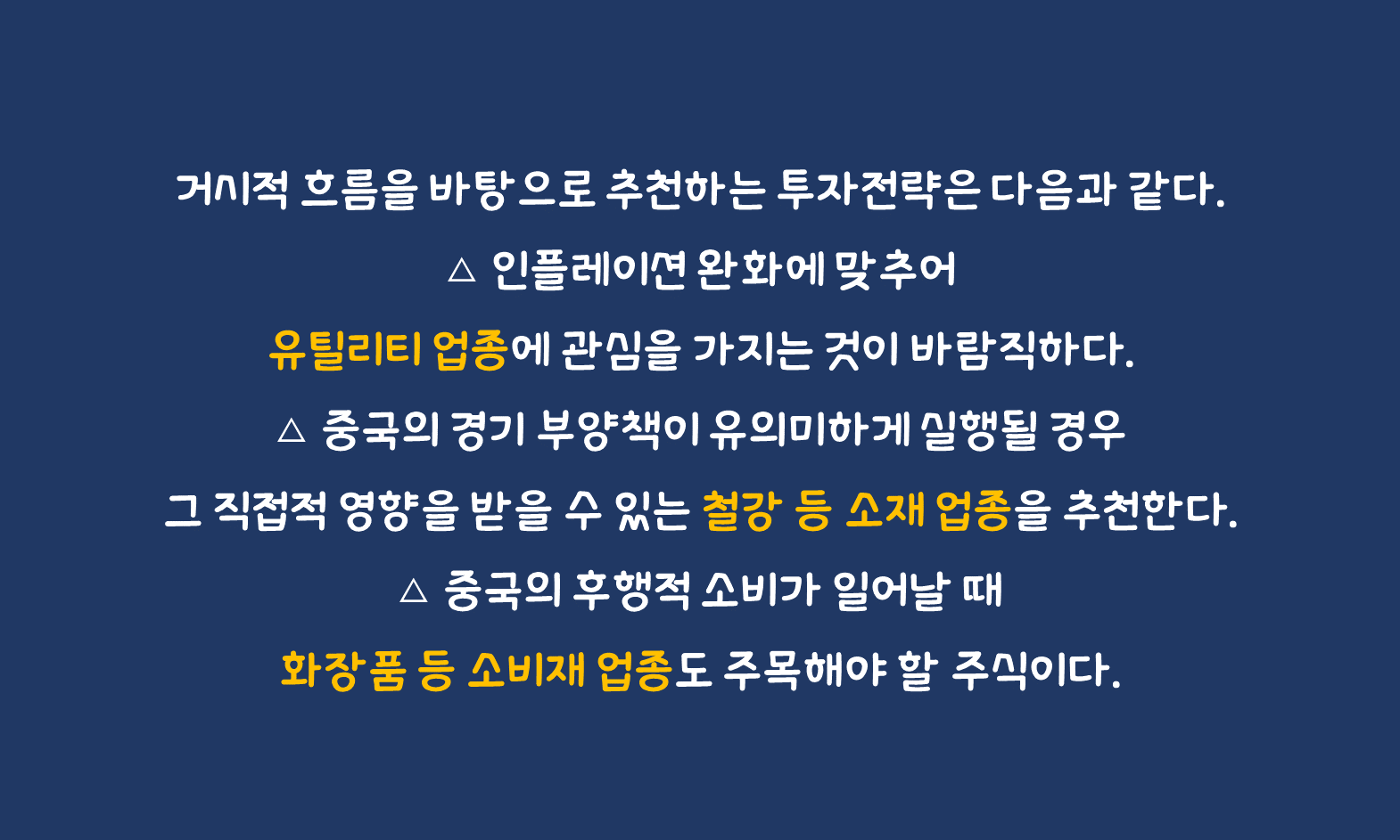 거시적 흐름을 바탕으로 추천하는 투자전략은 다음과 같다. △ 인플레이션 완화에 맞추어 유틸리티 업종에 관심을 가지는 것이 바람직하다. △ 중국의 경기 부양책이 유의미하게 실행될 경우 그 직접적 영향을 받을 수 있는 철강 등 소재 업종을 추천한다. △ 중국의 후행적 소비가 일어날 때 화장품 등 소비재 업종도 주목해야 할 주식이다.