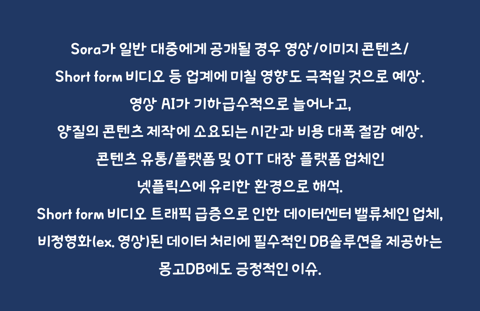 Sora가 일반 대중에게 공개될 경우 영상/이미지 콘텐츠/Short form 비디오 등 업계에 미칠 영향도 극적일 것으로 예상. 일례로 어도비가 7% 이상 주가 하락. 유니티, 어도비, 셔터스탁 등 이미지/영상 AI사업을 영위하는 업체의 단기 주가는 부정적으로 작용할 것. 주식시장 입장에서는 영상 AI가 기하급수적으로 늘어나고, 양질의 콘텐츠 제작에 소요되는 시간과 비용 대폭 절감 예상. 콘텐츠 유통/플랫폼 및 OTT 대장 플랫폼 업체인 넷플릭스에 유리한 환경으로 해석. Short form 비디오 트래픽 급증으로 인한 데이터센터 밸류체인 업체, 비정형화(ex. 영상)된 데이터 처리에 필수적인 DB솔루션을 제공하는 몽고DB에도 긍정적인 이슈.